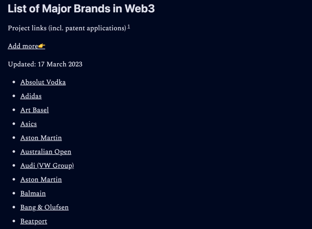 I put together a collection of all the major brands in Web3 (over 130 brands and over 30% of Interbrand's best 100 global brands), including the link to their Web3 projects.
